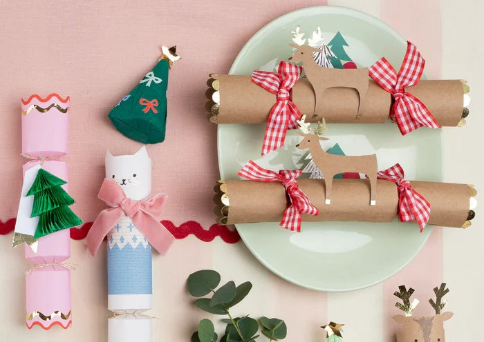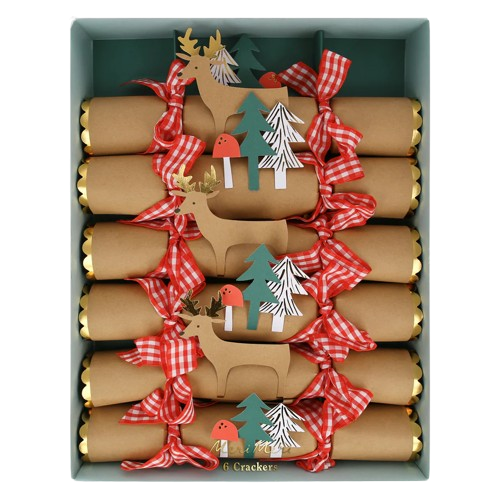Beautifully made Christmas crackers from Meri Meri in kraft paper with gingham ribbons and woodland flora and fauna 3D details – perfect if you want to bring the beauty of nature to your festive party table. And, they each contain a fun 'Guess Who' Christmas antler headband with cards – ideal to play during or after your meal for lots of festive cheer.