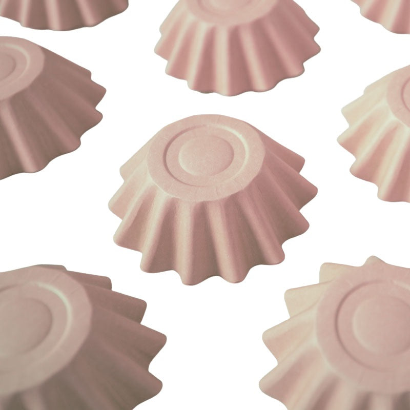 Bloom baking cups in pastel pink. Unique brioche shaped cases made from thick durable matte card. Versatile for use as cupcake cases, dessert cups & lolly cups. Also available in a mix of pastel shades.