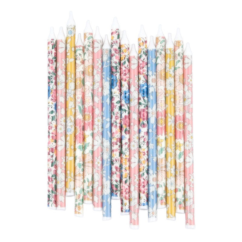 Meri Meri elegant floral print candle set, crafted in collaboration with Liberty, the iconic London department store. The floral print designs will instantly add statement to your celebrations. Perfect for any birthday party theme where you want soft tones, like a princess party, fairy party or a special decade. This set is beautifully presented in a box with a blue Liberty print design.