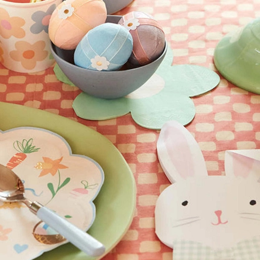 Super cute set of paper napkins from Meri Meri that will delight all your little bunnies. Each napkin features a bunny face with cut-out ears and gingham check bow in mint. Perfect for a bunny themed birthday party or an Easter celebration.