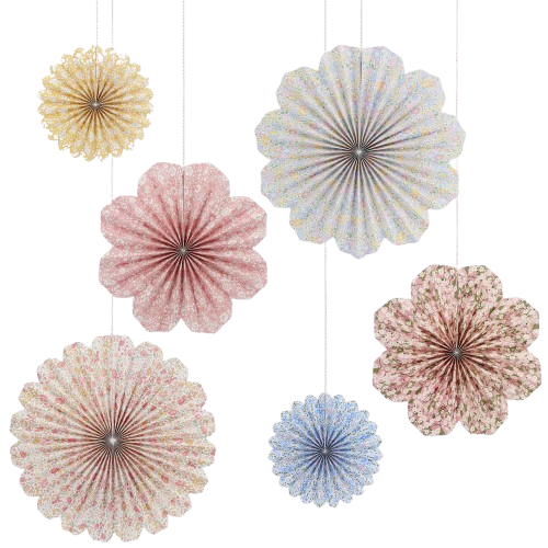 Oh so pretty floral pinwheel decorations from Meri Meri and Liberty of London. This pack of 6 comes in three sizes and assorted floral designs. Pinwheels are flat packed, simply open & hang. These decorations can be reused again & again. Pretty up a birthday party, baby shower, christening, engagement, wedding or special occasion.