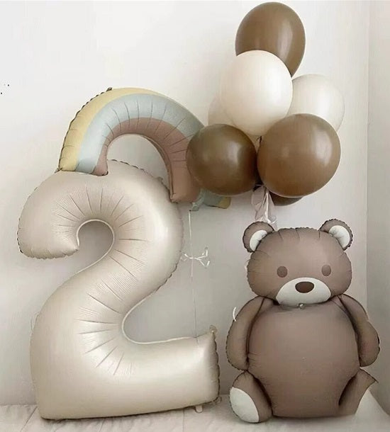 Giant teddy bear shaped foil balloon in matte brown & sand tones. Perfect for a teddy bear themed party or baby shower.