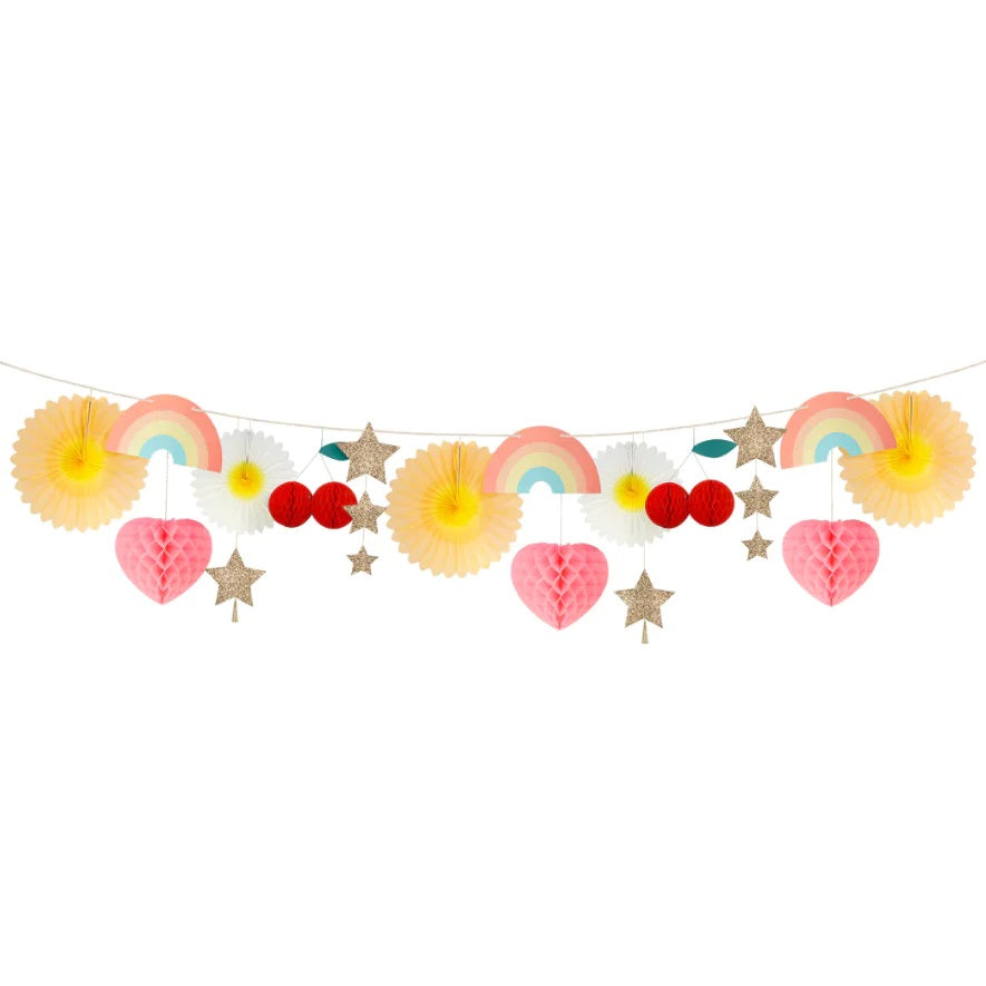 This giant happy & colourful garland from Meri Meri is a party in a box! A fabulous statement decoration to use party after party, or leave it in place for everyday fun. It's ideal as an Instagram party backdrop too. Pre-threaded honeycomb, pinweels, card and plant-based eco glitter pennants. Match with our happy icons range : )