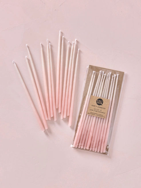 Set of twelve tall pure beeswax candles. Traditional ivory fades to pale pink. Perfect to pretty up a birthday party!